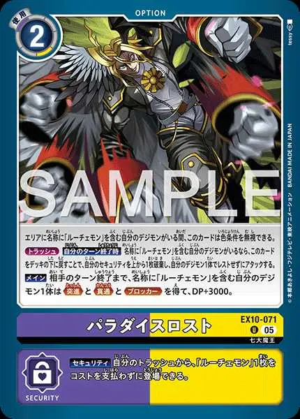 | 上段テキスト [効果] エリアに名称に「ルーチェモン」を含む自分のデジモンがいる間、このカードは色条件を無視できる。 {トラッシュ}【自分のターン終了時】名称に「ルーチェモン」を含む自分のデジモンがいるなら、このカードをデッキの下に戻すことで、自分のセキュリティを上から1枚破棄し、自分のデジモン1体でレストせずにアタックする。 【メイン】相手のターン終了まで、名称に「ルーチェモン」を含む自分のデジモン1体は≪突進≫と≪貫通≫と≪ブロッカー≫を得て、DP+3000。 下段テキスト [セキュリティ効果] 【セキュリティ】自分のトラッシュから、「ルーチェモン」1枚をコストを支払わずに登場できる。 | ||