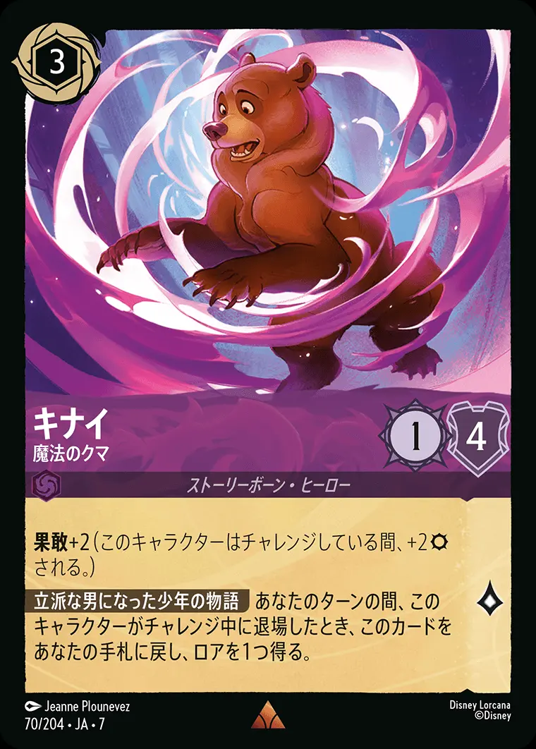 | 果敢+2(このキャラクターはチャレンジしている間、+2される。) 【立派な男になった少年の物語】 あなたのターンの間、このキャラクターがチャレンジ中に退場したとき、このカードをあなたの手札に戻し、ロアを1つ得る。 | ||