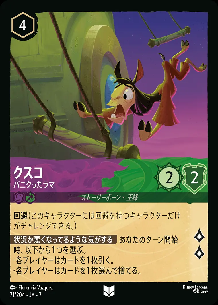 | 回避(このキャラクターには回避を持つキャラクターだけがチャレンジできる。) 【状況が悪くなってるような気がする】 あなたのターン開始時、以下から1つを選ぶ。 ・各プレイヤーはカードを1枚引く。 ・各プレイヤーはカードを1枚選んで捨てる。 | ||