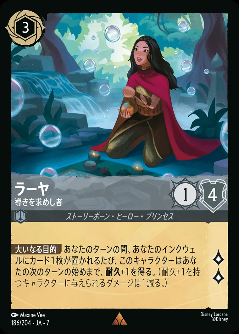 | 【大いなる目的】 あなたのターンの間、あなたのインクウェルにカード1枚が置かれるたび、このキャラクターはあなたの次のターンの始めまで、耐久+1を得る。(耐久+1を持つキャラクターに与えられるダメージは1減る。) | ||
