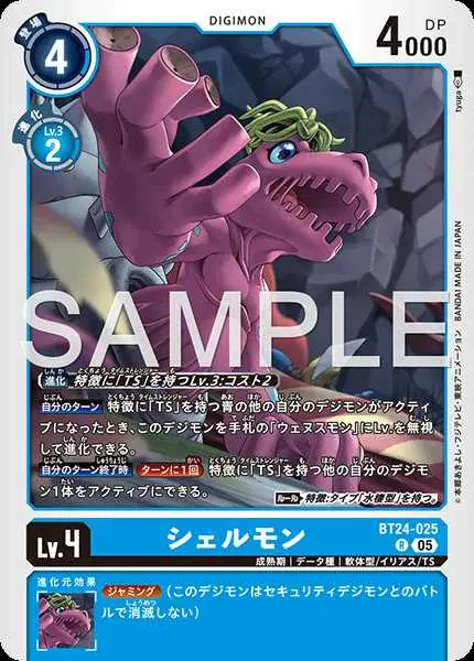 | 上段テキスト [特殊進化] 〔進化〕特徴に「TS」を持つLv.3:コスト2 [効果] 【自分のターン】特徴に「TS」を持つ青の他の自分のデジモンがアクティブになったとき、このデジモンを手札の「ウェヌスモン」にLv.を無視して進化できる。 【自分のターン終了時】[ターンに1回]特徴に「TS」を持つ他の自分のデジモン1体をアクティブにできる。 〈ルール〉特徴:タイプ「水棲型」を持つ。 下段テキスト [進化元効果] ≪ジャミング≫(このデジモンはセキュリティデジモンとのバトルで消滅しない) | ||