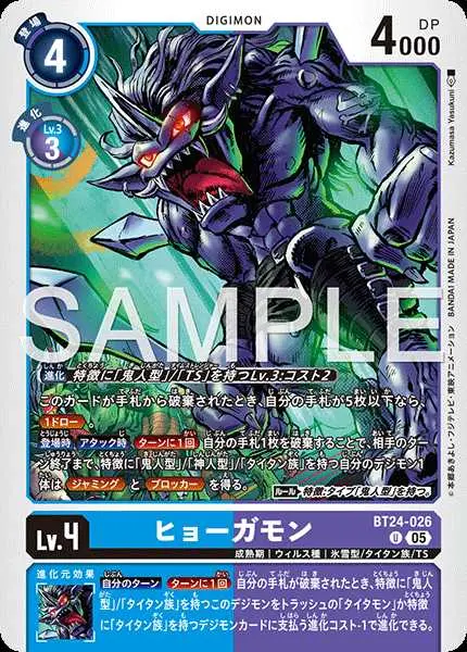 | 上段テキスト [特殊進化] 〔進化〕特徴に「鬼人型」/「TS」を持つLv.3:コスト2 [効果] このカードが手札から破棄されたとき、自分の手札が5枚以下なら、≪1ドロー≫。 【登場時】【アタック時】[ターンに1回]自分の手札1枚を破棄することで、相手のターン終了まで、特徴に「鬼人型」/「神人型」/「タイタン族」を持つ自分のデジモン1体は≪ジャミング≫と≪ブロッカー≫を得る。 〈ルール〉特徴:タイプ「鬼人型」を持つ。 下段テキスト [進化元効果] 【自分のターン】[ターンに1回]自分の手札が破棄されたとき、特徴に「鬼人型」/「タイタン族」を持つこのデジモンをトラッシュの「タイタモン」か特徴に「タイタン族」を持つデジモンカードに支払う進化コスト-1で進化できる。 | ||