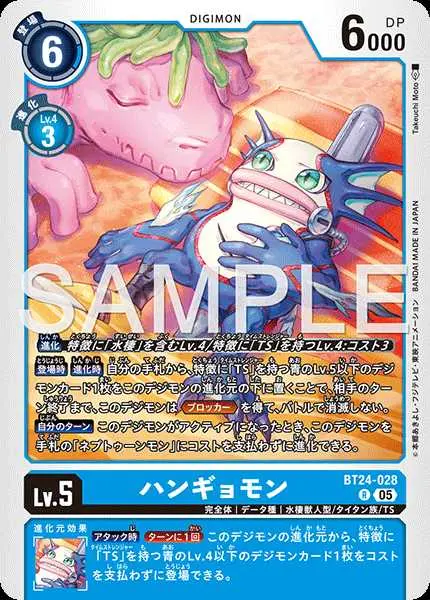 | 上段テキスト [特殊進化] 〔進化〕特徴に「水棲」を含むLv.4/特徴に「TS」を持つLv.4:コスト3 [効果] 【登場時】【進化時】自分の手札から、特徴に「TS」を持つ青のLv.5以下のデジモンカード1枚をこのデジモンの進化元の下に置くことで、相手のターン終了まで、このデジモンは≪ブロッカー≫を得て、バトルで消滅しない。 【自分のターン】このデジモンがアクティブになったとき、このデジモンを手札の「ネプトゥーンモン」にコストを支払わずに進化できる。 下段テキスト [進化元効果] 【アタック時】[ターンに1回]このデジモンの進化元から、特徴に「TS」を持つ青のLv.4以下のデジモンカード1枚をコストを支払わずに登場できる。 | ||