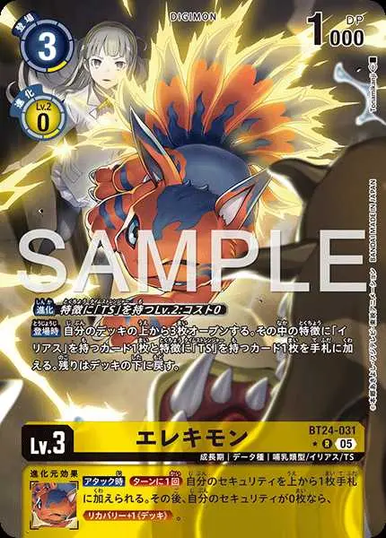 | 上段テキスト [特殊進化] 〔進化〕特徴に「TS」を持つLv.2:コスト0 [効果] 【登場時】自分のデッキの上から3枚オープンする。その中の特徴に「イリアス」を持つカード1枚と特徴に「TS」を持つカード1枚を手札に加える。残りはデッキの下に戻す。 下段テキスト [進化元効果] 【アタック時】[ターンに1回]自分のセキュリティを上から1枚手札に加えられる。その後、自分のセキュリティが0枚なら、≪リカバリー+1《デッキ》≫。 | ||