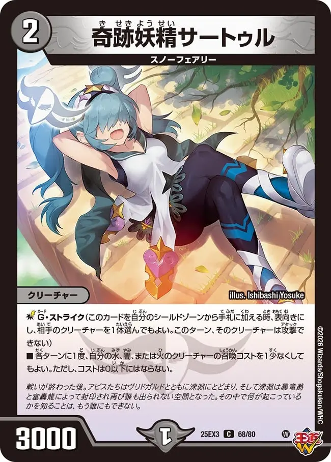 | ■ {GS} G・ストライク(このカードを自分のシールドゾーンから手札に加える時、表向きにし、相手のクリーチャーを1体選んでもよい。このターン、そのクリーチャーは攻撃できない) ■ 各ターンに1度、自分の水、闇、または火のクリーチャーの召喚コストを1少なくしてもよい。ただし、コストは0以下にはならない。 | ||