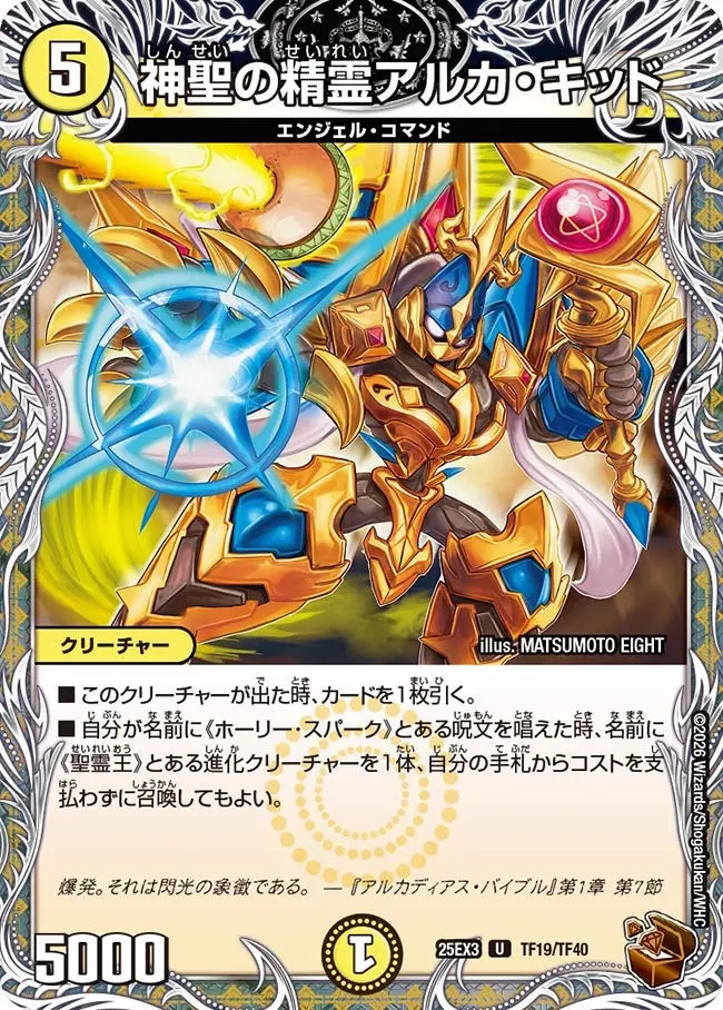 | ■ このクリーチャーが出た時、カードを1枚引く。 ■ 自分が名前に《ホーリー・スパーク》とある呪文を唱えた時、名前に《聖霊王》とある進化クリーチャーを1体、自分の手札からコストを支払わずに召喚してもよい。 | ||