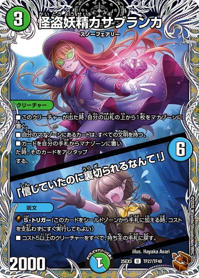 | ■ このクリーチャーが出た時、自分の山札の上から1枚をマナゾーンに置く。 ■ 自分のマナゾーンにあるカードは、すべての文明を持つ。 ■ カードを自分の手札からマナゾーンに置いた時、そのカードをアンタップする。 | ||