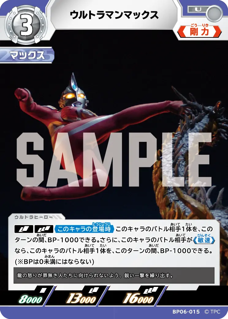 | [DBL][TRP]《このキャラの登場時》このキャラのバトル相手1体を、このターンの間、BP-1000できる。さらに、このキャラのバトル相手が 【敏速】 なら、このキャラのバトル相手1体を、このターンの間、BP-1000できる。(※BPは0未満にはならない) | ||