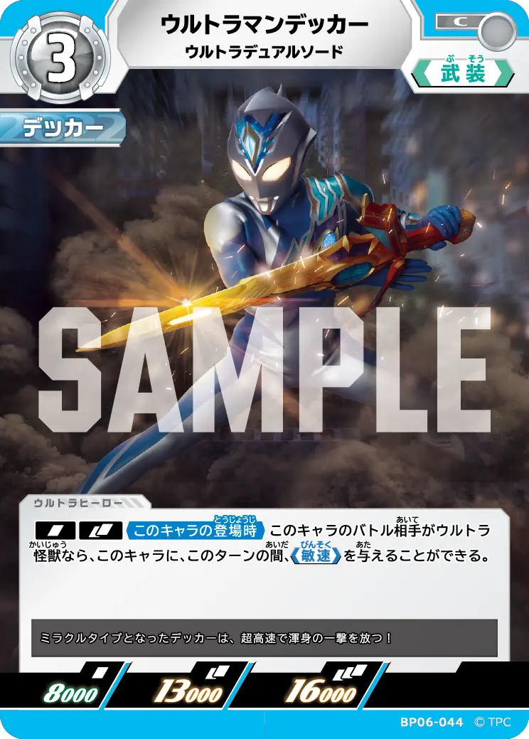 | [SIN][DBL]《このキャラの登場時》このキャラのバトル相手がウルトラ怪獣なら、このキャラに、このターンの間、 【敏速】 を与えることができる。 | ||