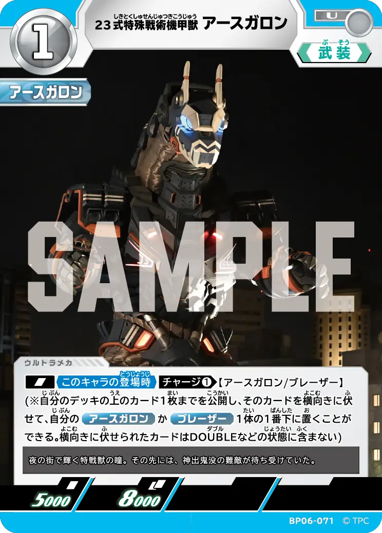 | [SIN]《このキャラの登場時》[チャージ ①]【アースガロン/ブレーザー】 (※自分のデッキの上のカード1枚までを公開し、そのカードを横向きに伏せて、自分の 『アースガロン』 か 『ブレーザー』 1体の1番下に置くことができる。横向きに伏せられたカードはDOUBLEなどの状態に含まない) | ||