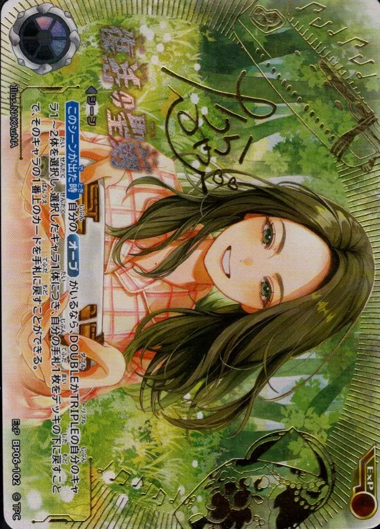 | 《このシーンが出た時》自分の 『オーブ』 がいるなら、DOUBLEかTRIPLEの自分のキャラ1~2体を選択し、選択したキャラ1体につき、自分の手札1枚をデッキの下に戻すことで、そのキャラの1番上のカードを手札に戻すことができる。 | ||