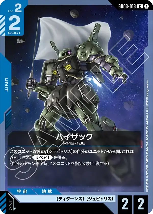| このユニット以外の、〔ジュピトリス〕の自分のユニットがいる間、これはAP+1され、《リペア1》を得る。 (自分のターン終了時、このユニットを指定の数回復する) | ||