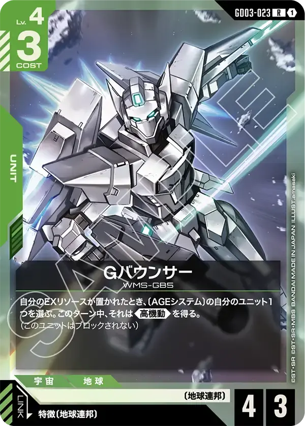 | 自分のEXリソースが置かれたとき、〔AGEシステム〕の自分のユニット1つを選ぶ。このターン中、それは《高機動》を得る。 (このユニットはブロックされない) | ||