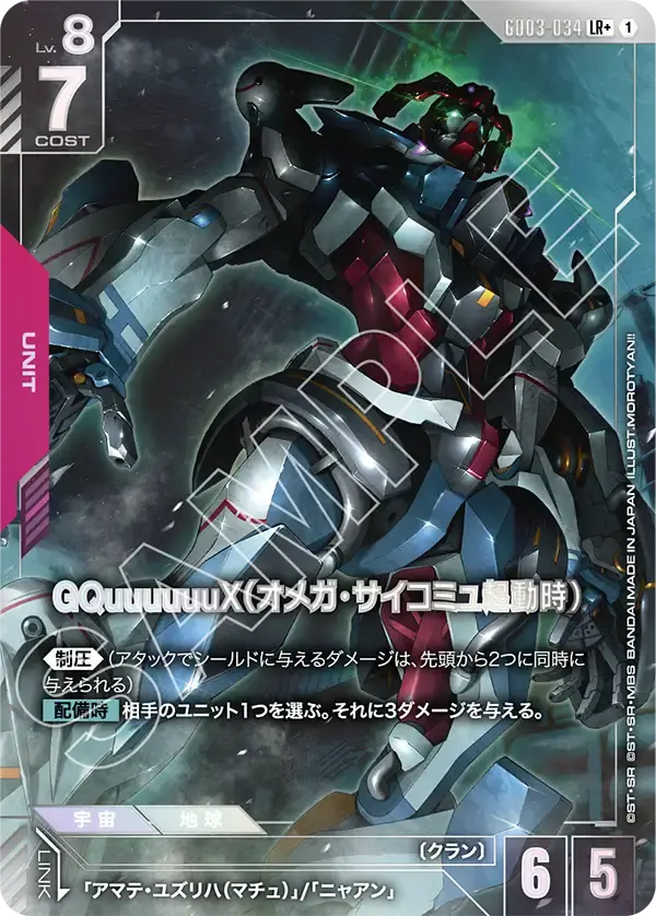 | 《制圧》(アタックでシールドに与えるダメージは、先頭から2つに同時に与えられる) 【配備時】相手のユニット1つを選ぶ。それに3ダメージを与える。 | ||