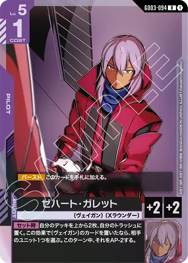 | 【バースト】このカードを手札に加える。 【セット時】自分のデッキを上から2枚、自分のトラッシュに置く。この効果で〔ヴェイガン〕のカードを置いたなら、相手のユニット1つを選ぶ。このターン中、それをAP-2する。 | ||