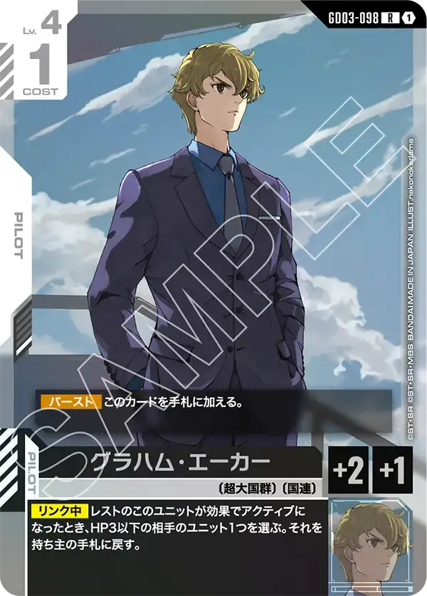 | 【バースト】このカードを手札に加える。 【リンク中】レストのこのユニットが効果でアクティブになったとき、HP3以下の相手のユニット1つを選ぶ。それを持ち主の手札に戻す。 | ||