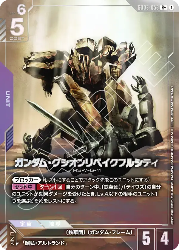 | 《ブロッカー》(レストにすることでアタック先をこのユニットにする) 【セット中】【ターン1回】自分のターン中、〔鉄華団〕/〔テイワズ〕の自分のユニットが効果ダメージを受けたとき、Lv.4以下の相手のユニット1つを選ぶ。それをレストにする。 | ||