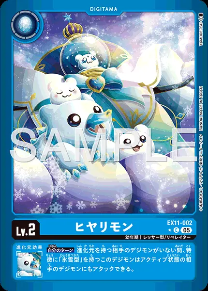 | 下段テキスト [進化元効果] 【自分のターン】進化元を持つ相手のデジモンがいない間、特徴に「氷雪型」を持つこのデジモンはアクティブ状態の相手のデジモンにもアタックできる。 | ||