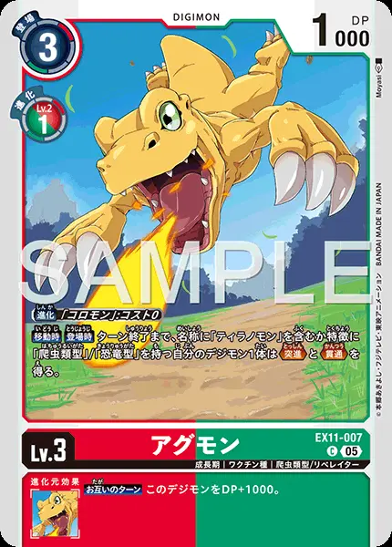 | 上段テキスト [特殊進化] 〔進化〕「コロモン」:コスト0 [効果] 【移動時】【登場時】ターン終了まで、名称に「ティラノモン」を含むか特徴に「爬虫類型」/「恐竜型」を持つ自分のデジモン1体は≪突進≫と≪貫通≫を得る。 下段テキスト [進化元効果] 【お互いのターン】このデジモンをDP+1000。 | ||