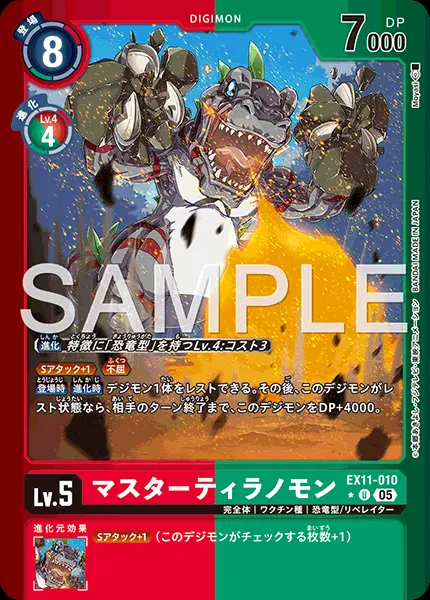 | 上段テキスト [特殊進化] 〔進化〕特徴に「恐竜型」を持つLv.4:コスト3 [効果] ≪Sアタック+1≫≪不屈≫ 【登場時】【進化時】デジモン1体をレストできる。その後、このデジモンがレスト状態なら、相手のターン終了まで、このデジモンをDP+4000。 下段テキスト [進化元効果] ≪Sアタック+1≫(このデジモンがチェックする枚数+1) | ||