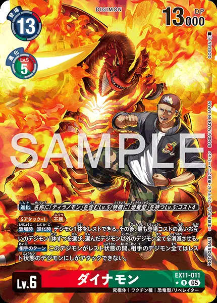 | 上段テキスト [特殊進化] 〔進化〕名称に「ティラノモン」を含むLv.5/特徴に「恐竜型」を持つLv.5:コスト4 [効果] ≪Sアタック+1≫≪不屈≫ 【登場時】【進化時】デジモン1体をレストできる。その後、最も登場コストの高いお互いのデジモン1体ずつを選び、選んだデジモン以外のデジモン全てを消滅させる。 【相手のターン】このデジモンがレスト状態の間、相手のデジモン全てはレスト状態のデジモンにしかアタックできない。 | ||