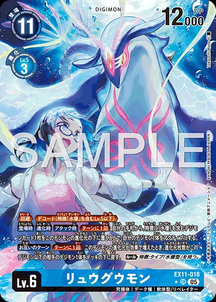 | 上段テキスト [効果] ≪回避≫≪デコード《特徴「水棲」を含むLv.5以下》≫ 【登場時】【進化時】【アタック時】[ターンに1回]自分の手札から、特徴に「水棲」を含むデジモンカード1枚をこのデジモンの進化元の下に置くことで、自分のデジモン1体をアクティブにする。 【お互いのターン】[ターンに1回]このデジモンの進化元が効果で増えたとき、進化元枚数がこのデジモン以下の相手のデジモン1体をデッキの下に戻す。 〈ルール〉特徴:タイプ「水棲型」を持つ。 | ||