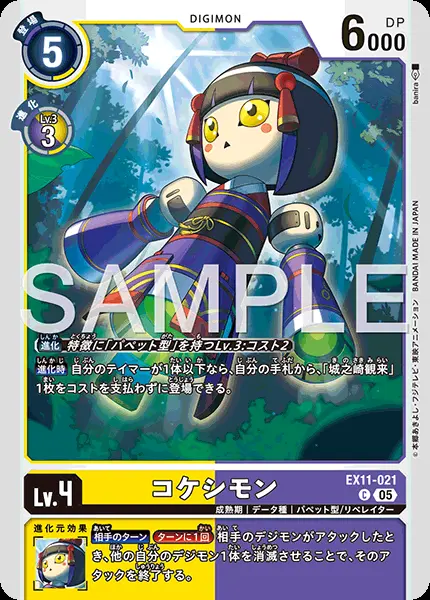 | 上段テキスト [特殊進化] 〔進化〕特徴に「パペット型」を持つLv.3:コスト2 [効果] 【進化時】自分のテイマーが1体以下なら、自分の手札から、「城之崎観来」1枚をコストを支払わずに登場できる。 下段テキスト [進化元効果] 【相手のターン】[ターンに1回]相手のデジモンがアタックしたとき、他の自分のデジモン1体を消滅させることで、そのアタックを終了する。 | ||