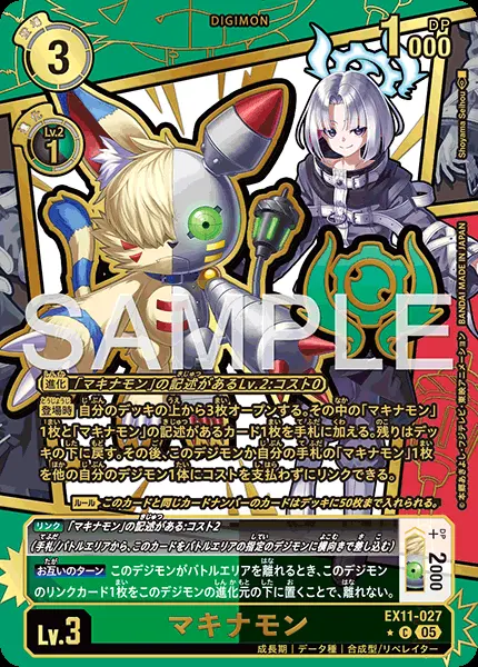 | 上段テキスト [特殊進化] 〔進化〕「マキナモン」の記述があるLv.2:コスト0 [効果] 【登場時】自分のデッキの上から3枚オープンする。その中の「マキナモン」1枚と「マキナモン」の記述があるカード1枚を手札に加える。残りはデッキの下に戻す。その後、このデジモンか自分の手札の「マキナモン」1枚を他の自分のデジモン1体にコストを支払わずにリンクできる。 〈ルール〉このカードと同じカードナンバーのカードはデッキに50枚まで入れられる。 下段テキスト [リンクDP] DP+2000 [リンク条件] 〈リンク〉「マキナモン」の記述がある:コスト2(手札/バトルエリアから、このカードをバトルエリアの指定のデジモンに横向きで差し込む) [リンク中効果] 【お互いのターン】このデジモンがバトルエリアを離れるとき、このデジモンのリンクカード1枚をこのデジモンの進化元の下に置くことで、離れない。 | ||