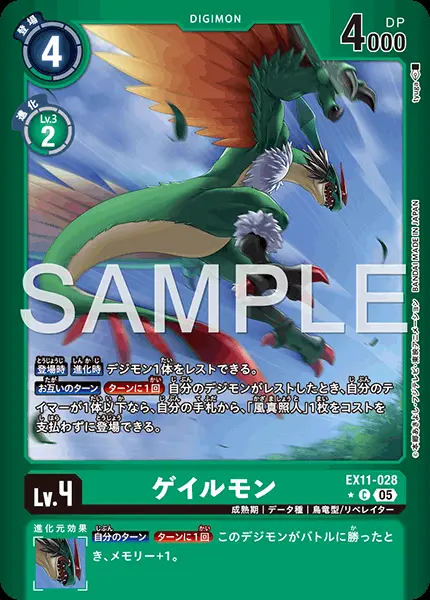 | 上段テキスト [効果] 【登場時】【進化時】デジモン1体をレストできる。 【お互いのターン】[ターンに1回]自分のデジモンがレストしたとき、自分のテイマーが1体以下なら、自分の手札から、「風真照人」1枚をコストを支払わずに登場できる。 下段テキスト [進化元効果] 【自分のターン】[ターンに1回]このデジモンがバトルに勝ったとき、メモリー+1。 | ||