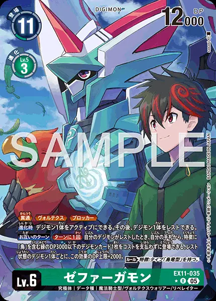 | 上段テキスト [効果] ≪貫通≫≪ヴォルテクス≫≪ブロッカー≫ 【進化時】デジモン1体をアクティブにできる。その後、デジモン1体をレストできる。 【お互いのターン】[ターンに1回]自分のデジモンがレストしたとき、自分の手札から、特徴に「鳥」を含む緑のDP3000以下のデジモンカード1枚をコストを支払わずに登場できる。レスト状態のデジモン1体ごとに、この効果のDP上限+2000。 〈ルール〉特徴:タイプ「鳥竜型」を持つ。 | ||