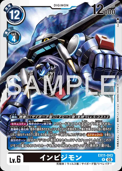 | 上段テキスト [特殊進化] 〔進化〕特徴に「サイボーグ型」/「マシーン型」を持つLv.5:コスト3 [効果] {セキュリティ}【相手のターン終了時】このカードをコストを支払わずに登場させる。 【登場時】【進化時】相手の裏向きのセキュリティを上から1枚表向きにし、最も登場コストの低い相手のデジモン1体をデッキの下に戻す。その後、自分のターン終了まで、このデジモンは≪Sアタック+1≫を得る。 【自分のターン】自分のデジモンが表向きのセキュリティをチェックしたとき、このデジモンに重ねられているカードを上から1枚セキュリティの下に表向きで置ける。 | ||