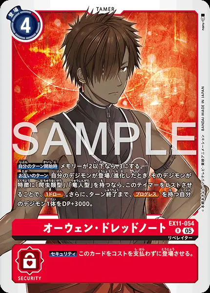 | 上段テキスト [効果] 【自分のターン開始時】メモリーが2以下なら、3にする。 【お互いのターン】自分のデジモンが登場/進化したとき、そのデジモンが特徴に「爬虫類型」/「竜人型」を持つなら、このテイマーをレストさせることで、≪1ドロー≫。さらに、ターン終了まで、≪プログレス≫を持つ自分のデジモン1体をDP+3000。 下段テキスト [セキュリティ効果] 【セキュリティ】このカードをコストを支払わずに登場させる。 | ||
