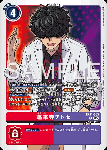 | 上段テキスト [効果] 【登場時】【自分のメインフェイズ開始時】自分の手札から、特徴に「合成型」/「邪神型」を持つカード1枚を破棄することで、≪1ドロー≫し、メモリー+1。 【お互いのターン】特徴に「合成型」/「邪神型」を持つ自分のデジモンが消滅したとき、このテイマーをレストさせることで、自分の手札から、「ガジモン」/「ギザモン」1枚をコストを支払わずに登場できる。 下段テキスト [セキュリティ効果] 【セキュリティ】このカードをコストを支払わずに登場させる。 | ||