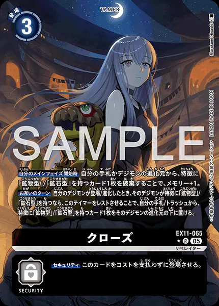 | 上段テキスト [効果] 【自分のメインフェイズ開始時】自分の手札かデジモンの進化元から、特徴に「鉱物型」/「鉱石型」を持つカード1枚を破棄することで、メモリー+1。 【お互いのターン】自分のデジモンが登場/進化したとき、そのデジモンが特徴に「鉱物型」/「鉱石型」を持つなら、このテイマーをレストさせることで、自分の手札/トラッシュから、特徴に「鉱物型」/「鉱石型」を持つカード1枚をそのデジモンの進化元の下に置ける。 下段テキスト [セキュリティ効果] 【セキュリティ】このカードをコストを支払わずに登場させる。 | ||