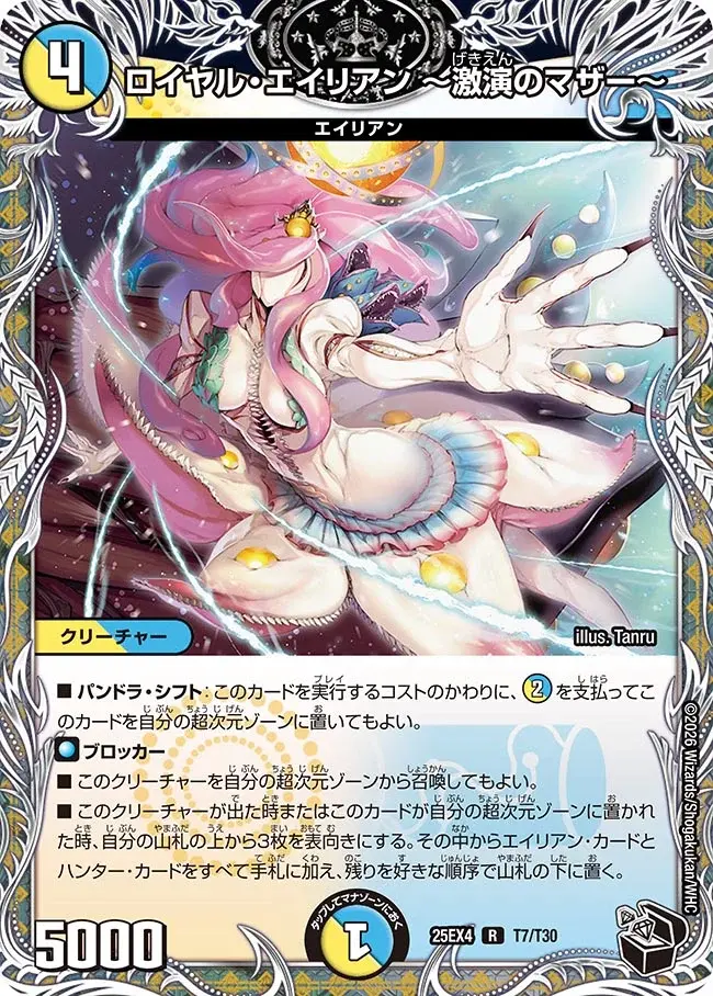 | ■ パンドラ・シフト:このカードを実行するコストのかわりに、[lw02]を支払ってこのカードを自分の超次元ゾーンに置いてもよい。 ブロッカー ■ このクリーチャーを自分の超次元ゾーンから召喚してもよい。 ■ このクリーチャーが出た時またはこのカードが自分の超次元ゾーンに置かれた時、自分の山札の上から3枚を表向きにする。その中からエイリアン・カードとハンター・カードをすべて手札に加え、残りを好きな順序で山札の下に置く。 | ||