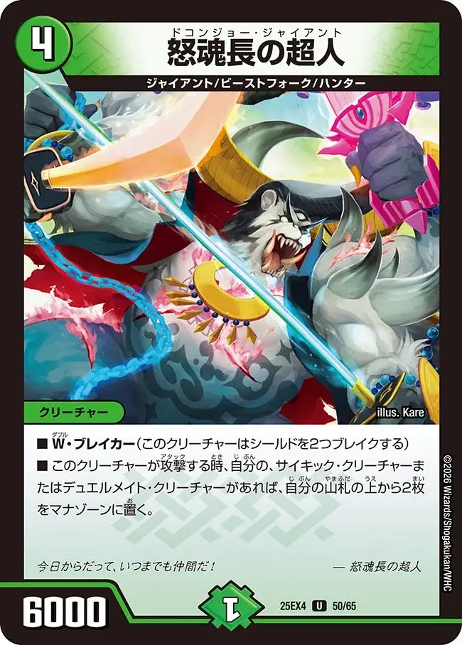 | ■ W・ブレイカー(このクリーチャーはシールドを2つブレイクする) ■ このクリーチャーが攻撃する時、自分の、サイキック・クリーチャーまたはデュエルメイト・クリーチャーがあれば、自分の山札の上から2枚をマナゾーンに置く。 | ||