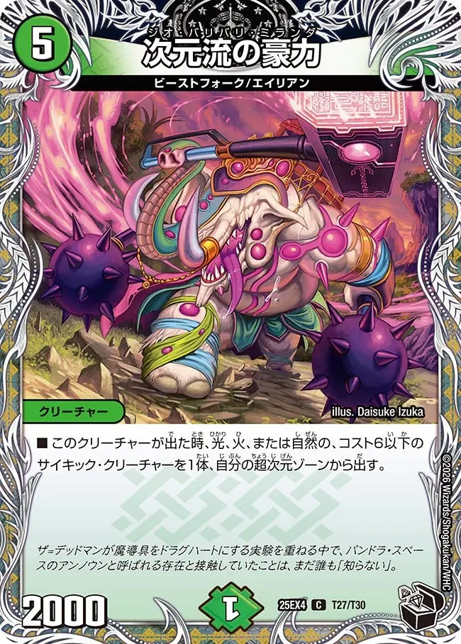 | ■ このクリーチャーが出た時、光、火、または自然の、コスト6以下のサイキック・クリーチャーを1体、自分の超次元ゾーンから出す。 | ||