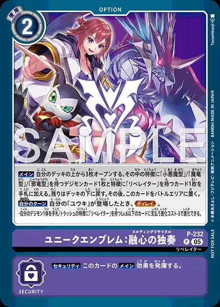 | 上段テキスト [効果] 【メイン】自分のデッキの上から3枚オープンする。その中の特徴に「小悪魔型」/「魔竜型」/「邪竜型」を持つデジモンカード1枚と特徴に「リベレイター」を持つカード1枚を手札に加える。残りはデッキの下に戻す。その後、このカードをバトルエリアに置く。 【自分のターン】自分の「ユウキ」が登場したとき、≪ディレイ≫。 ・自分のデジモン1体を手札/トラッシュの特徴に「リベレイター」を持つLv.6以下のカードに支払う進化コスト-3で進化できる。 下段テキスト [セキュリティ効果] 【セキュリティ】このカードの【メイン】効果を発揮する。 | ||