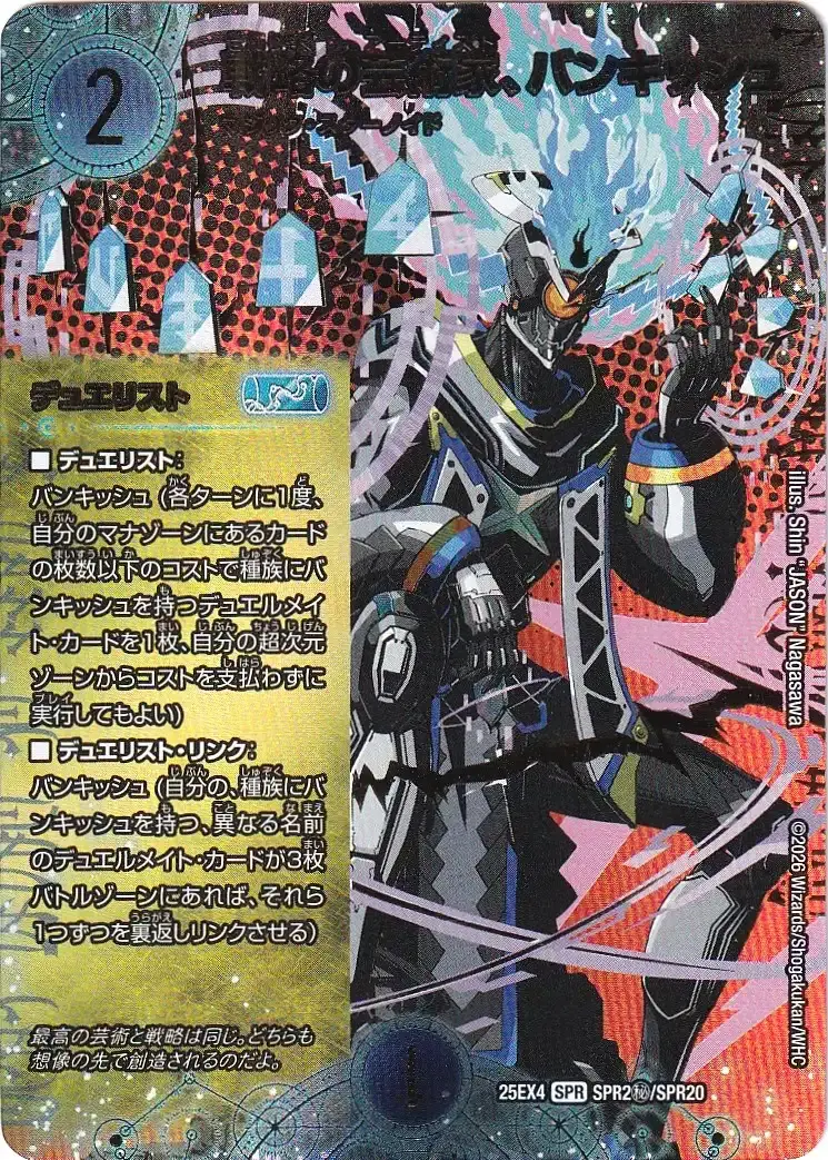 | ■ デュエリスト:バンキッシュ (各ターンに1度、自分のマナゾーンにあるカードの枚数以下のコストで種族にバンキッシュを持つデュエルメイト・カードを1枚、自分の超次元ゾーンからコストを支払わずに実行してもよい) ■ デュエリスト・リンク:バンキッシュ (自分の、種族にバンキッシュを持つ、異なる名前のデュエルメイト・カードが3枚バトルゾーンにあれば、それら1つずつを裏返しリンクさせる) | ||
