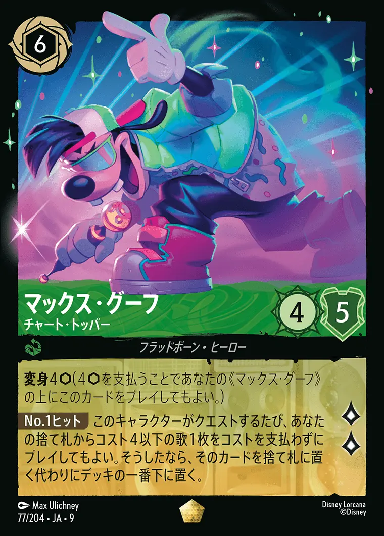 | 変身4(4を支払うことであなたの《マックス・グーフ》の上にこのカードをプレイしてもよい。) 【No.1ヒット】 このキャラクターがクエストするたび、あなたの捨て札からコスト4以下の歌1枚をコストを支払わずにプレイしてもよい。そうしたなら、そのカードを捨て札に置く代わりにデッキの一番下に置く。 | ||