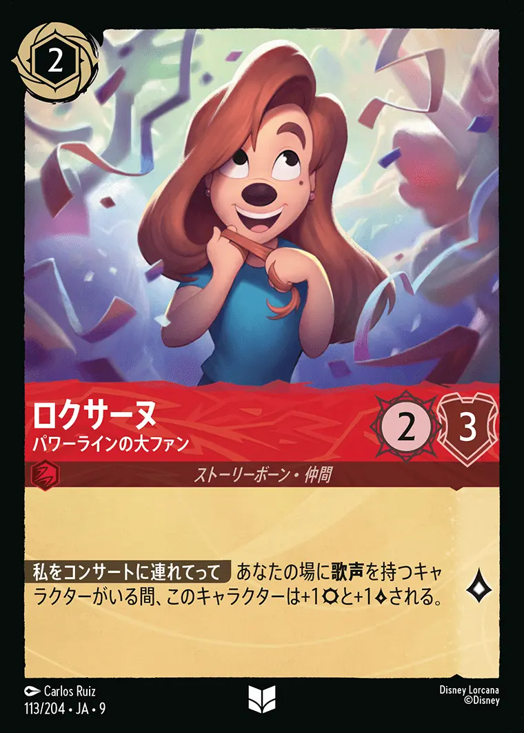 | 【私をコンサートに連れてって】 あなたの場に歌声を持つキャラクターがいる間、このキャラクターは+1と+1される。 | ||