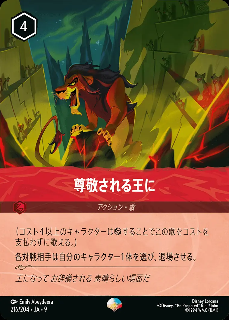 | (コスト4以上のキャラクターはすることでこの歌をコストを支払わずに歌える。) 各対戦相手は自分のキャラクター1体を選び、退場させる。 | ||