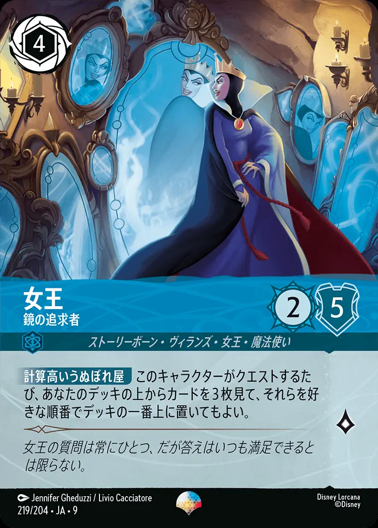 | 【計算高いうぬぼれ屋】 このキャラクターがクエストするたび、あなたのデッキの上からカードを3枚見て、それらを好きな順番でデッキの一番上に置いてもよい。 | ||