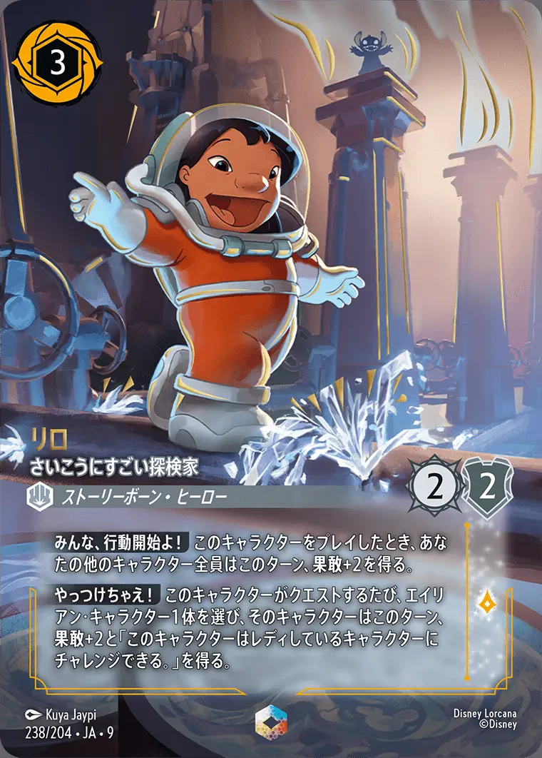 | 【みんな、行動開始よ!】 このキャラクターをプレイしたとき、あなたの他のキャラクター全員はこのターン、果敢+2を得る。 【やっつけちゃえ!】 このキャラクターがクエストするたび、エイリアン・キャラクター1体を選び、そのキャラクターはこのターン、果敢+2と「このキャラクターはレディしているキャラクターにチャレンジできる。」を得る。 | ||
