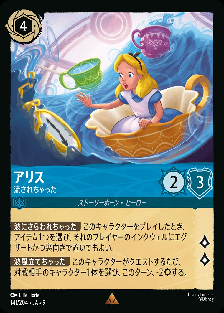 | 【波にさらわれちゃった】 このキャラクターをプレイしたとき、アイテム1つを選び、それのプレイヤーのインクウェルにエグザートかつ裏向きで置いてもよい。 【波風立てちゃった】 このキャラクターがクエストするたび、対戦相手のキャラクター1体を選び、このターン、-2する。 | ||
