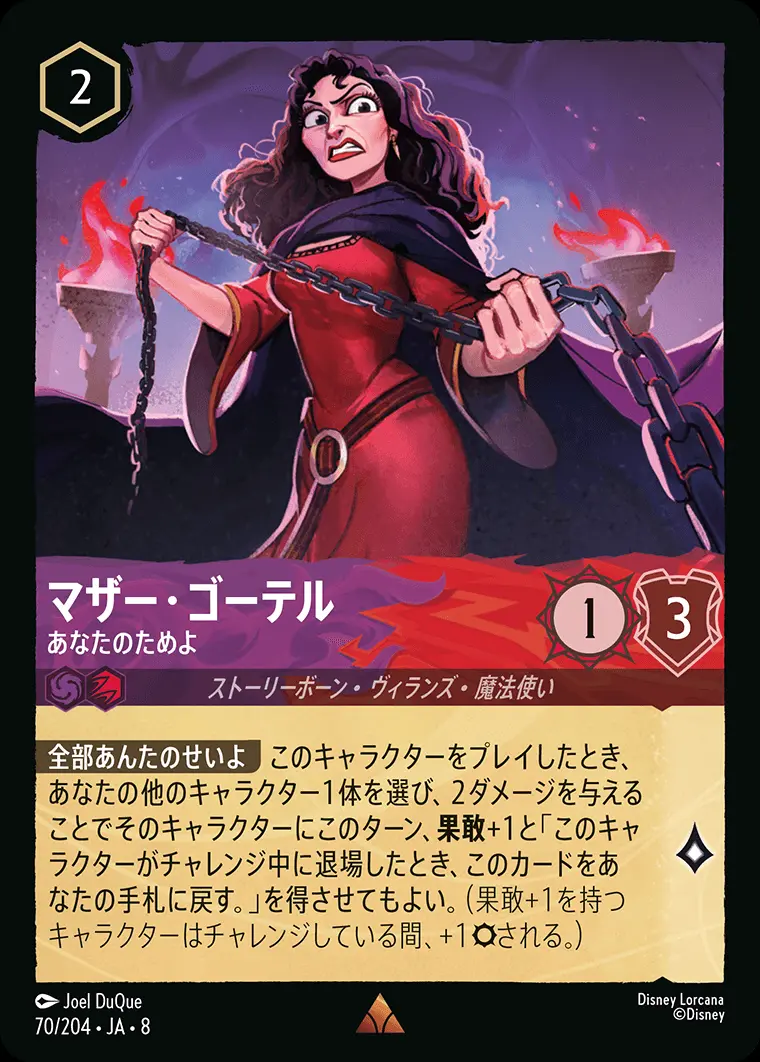 | 【全部あんたのせいよ】 このキャラクターをプレイしたとき、あなたの他のキャラクター1体を選び、2ダメージを与えることでそのキャラクターにこのターン、果敢+1と「このキャラクターがチャレンジ中に退場したとき、このカードをあなたの手札に戻す。」を得させてもよい。(果敢+1を持つキャラクターはチャレンジしている間、+1される。) | ||