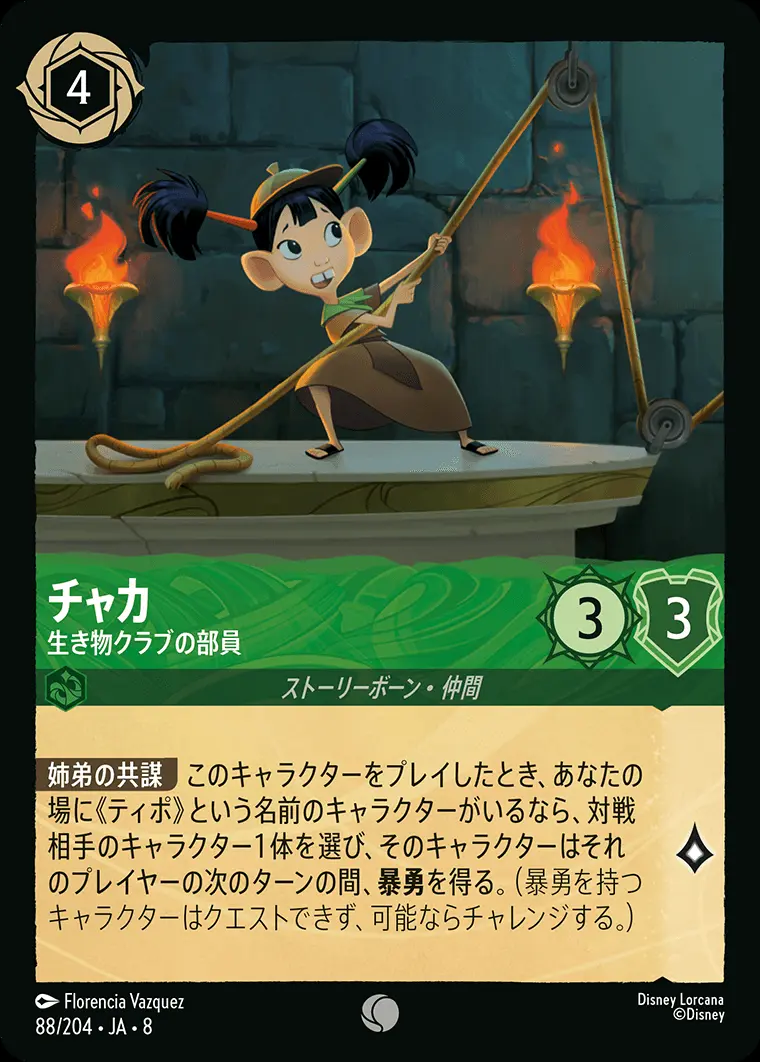 【姉弟の共謀】 このキャラクターをプレイしたとき、あなたの場に《ティポ》という名前のキャラクターがいるなら、対戦相手のキャラクター1体を選び、そのキャラクターはそれのプレイヤーの次のターンの間、暴勇を得る。(暴勇を持つキャラクターはクエストできず、可能ならチャレンジする。)