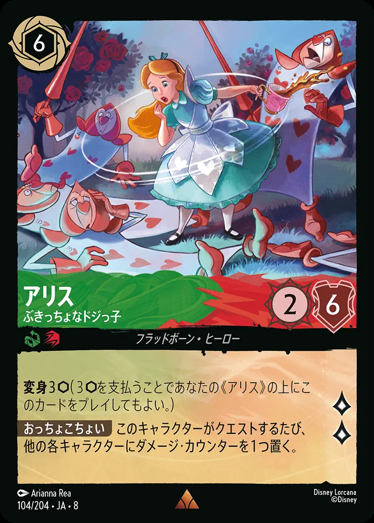 | 変身3(3を支払うことであなたの《アリス》の上にこのカードをプレイしてもよい。) 【おっちょこちょい】 このキャラクターがクエストするたび、他の各キャラクターにダメージ・カウンターを1つ置く。 | ||