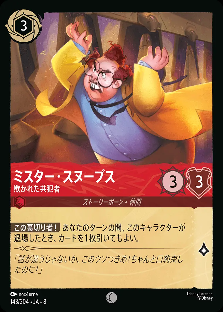 | 【この裏切り者!】 あなたのターンの間、このキャラクターが退場したとき、カードを1枚引いてもよい。 | ||