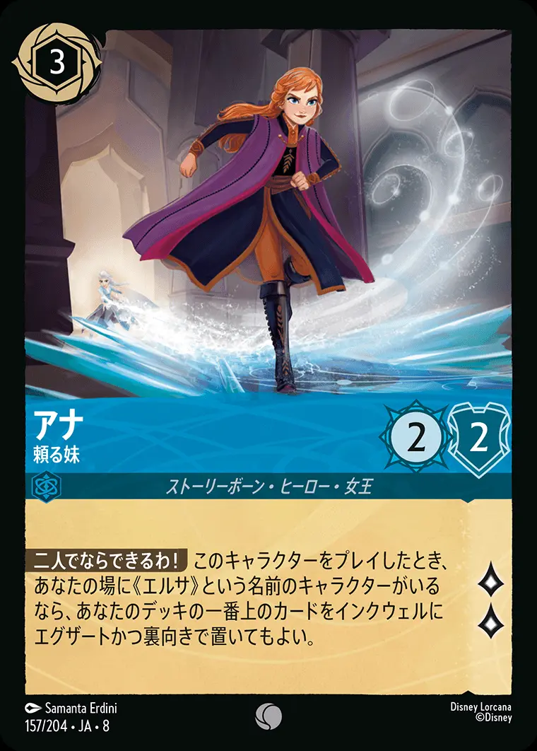 | 【二人でならできるわ!】 このキャラクターをプレイしたとき、あなたの場に《エルサ》という名前のキャラクターがいるなら、あなたのデッキの一番上のカードをインクウェルにエグザートかつ裏向きで置いてもよい。 | ||